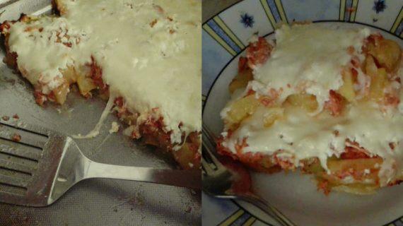 Καθαρίζουμε πατάτες κ τις κόβουμε ,τις βάζουμε σε λαδόκολλα και τις ψηνουμε στο γκριλ. Πολτοποιούμε 6 ντομάτες και τις βαζουμε στο τηγανι με λιγο λαδι και αλάτι εφοσον βράσει η σάλτσα σπαμε 5 αυγα τα ανακατευουμε και τα Ρίχνουμε και αυτα στο τηγάνι οταν δέσουν τα υλικα σε μια στραπατσάδα το κατεβαζουμε απο την φωτιά. Βαζουμε τις πατάτες στο ταψι,στρώνουμε απο πανω και την στραπατσάδα, μετα Ρίχνουμε τριμμένο τυρι φετα και κασέρι το βαζουμε στο φούρνο μεχρι να λιωσουν τα τυριά και ειναι έτοιμο.