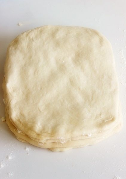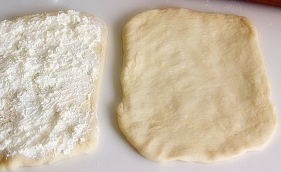 Προετοιμασία Τοποθετείται όλα τα υλικά για την ζύμη μέσα σε κοσκινισμένο αλεύρι και ζυμώνεται την ζύμη. Η ζύμη σας θα είναι μαλακή. Αφήνεται την ζύμη σε ζεστό μέρος για μία ώρα για να ξεκουραστεί και να φουσκώσει. Χτυπάτε τη μαργαρίνη (θερμοκρασίας δωματίου) για να μαλακώσει και να μπορείτε να αλείψετε την ζύμη σας. Αν το τυρί σας δεν είναι αλμυρό, αλατίστε το. Χωρίζεται την ζύμη σας σε 4 μέρη και ανοίγεται το κάθε μέρος σε ομοιόμορφα ορθογώνια πάχους 1 εκατοστού. Αλείφεται την ζύμη με την μαργαρίνη και μετά βάζετε την φέτα