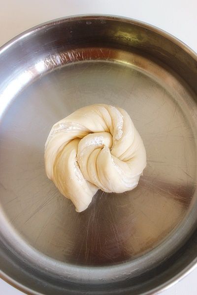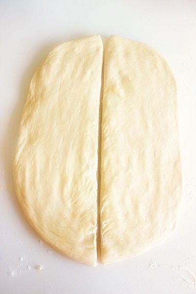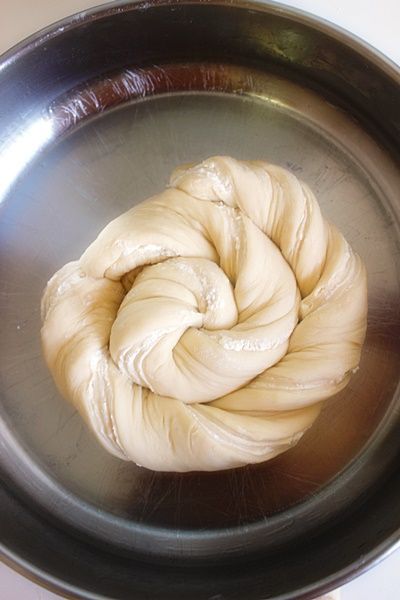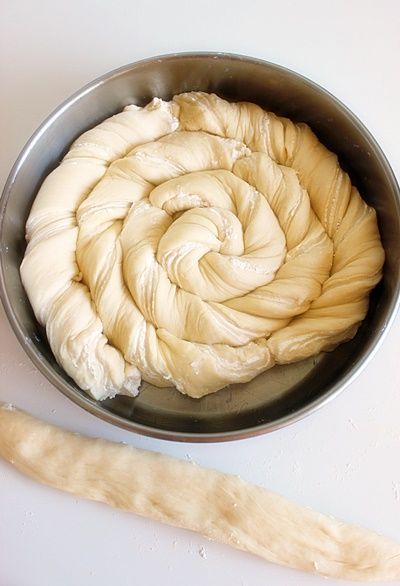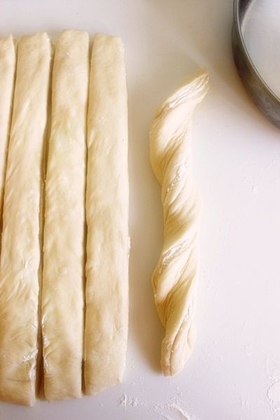 Μοιράζεται την ζύμη στην μέση και στην συνέχεια το κάθε μέρος σε δύο ώστε να πάρετε 6 λωρίδες ζύμης. Παίρνεται την λωρίδα και γυρίζεται την πάνω πλευρά στα δεξιά και την κάτω προς τα αριστερά για να έχει το σχήμα της φωτογραφίας