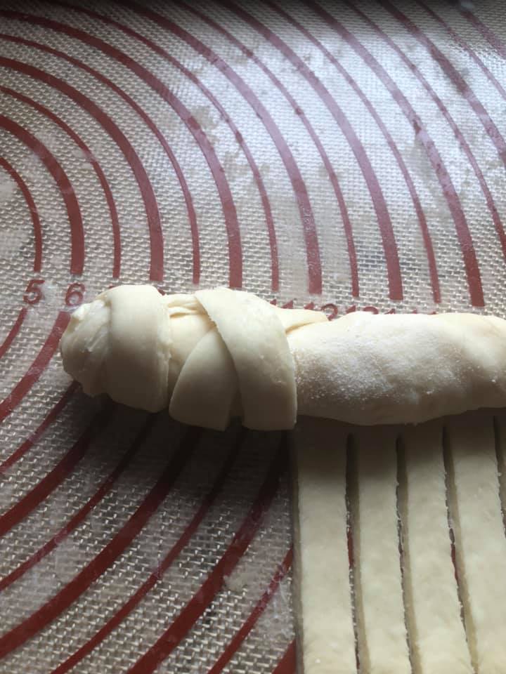 Σχηματίζουμε ένα “χ” . Το περίσσευμα από τις λουρίδες το βάζουμε στο μέρος της τυροπιτας. Μπορείτε να δοκιμάσετε την διαδικασία του τυλίγματος με μια χαρτοπετσέτα, έτσι ώστε να πάρει το χέρι σας το κολάι.