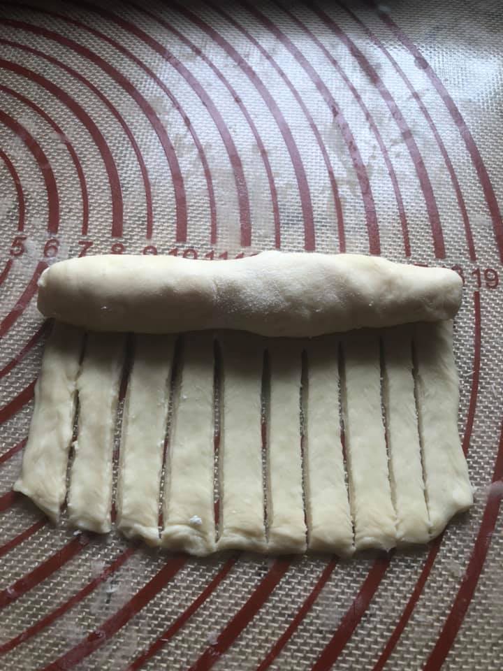 Για να φτιάξουμε το φύλλο μας βάζουμε σε ένα μπολ το γάλα, την ζάχαρη, την μαγιά, το αλάτι και το αλεύρι και αφού το πλάσουμε καλά κάνουμε ένα ζυμαράκι. Μόλις η ζύμη μας είναι έτοιμη κάνουμε ένα λακάκι και ρίχνουμε στο λακάκι έναν κύβο βούτυρο. Στη συνέχεια το ξανά ζυμώνουμε.