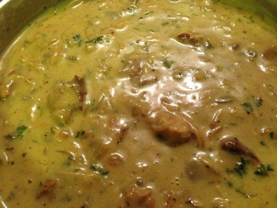 Στο διάστημα αυτό, διαλύουμε στην μανιταρόσουπα σε βραστό νερό (το μισό από όσο λέει το φακελάκι) και την ρίχνουμε στην κατσαρόλα ανακατεύοντας ώστε να πάει παντού και να αρχίσει να δένει η σάλτσα. Βάζουμε το μάτι στην χαμηλότερη ένταση και ρίχνουμε σιγά σιγά λίγη από τη σάλτσα στο γιαούρτι ανακατεύοντάς ώστε να ανέβει η θερμοκρασία του και να μην κόψει.