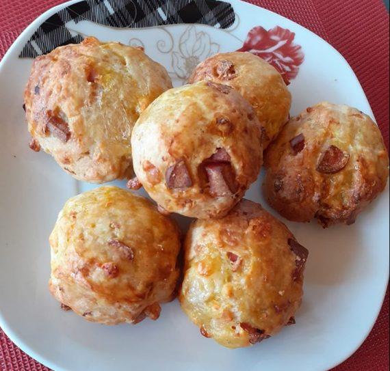 Ανακατεύουμε λίγο με σύρμα όλα τα υλικά εκτός από το αλεύρι το τυρί και τα λουκάνικα! Προσθέτουμε λίγο λίγο το αλεύρι και όλα τα υλικά μας και ζυμώνουμε με το χέρι απαλά! Πλάθουμε μπαλίτσες και τις αραδιάζουμε σε λαδόκολλα! Αυγουλώνουμε και ψήνουμε στους 170 βαθμούς στον αέρα για 15-20 λεπτά ανάλογα τον φούρνο σας! Γίνανε υπέροχα!!