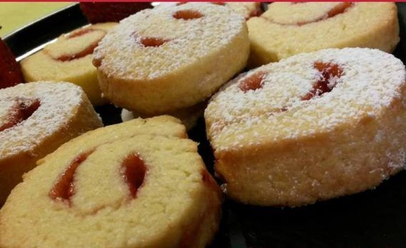 COOKIES ΣΤΡΟΒΙΛΑΚΙΑ ΜΑΡΜΕΛΑΔΑΣ !!! Λαχταριστά και πολύ εύκολα Cookies με γέμιση μαρμελάδας φράουλας ή όποια άλλη γεύση επιθυμείτε ! Δε σταματάς να τα τρως !!! Υλικά για 35-40 Cookies : – 450 γρ. αλεύρι γ.ο.χ. – 200 γρ. Ζάχαρη – 2 κάψουλες βανίλιας – 1 πρέζα αλάτι – 250 γρ. βούτυρο μαλακό (κομμένο σε κυβάκια) – 2 αυγά (μόνο τους κρόκους) – 2 κ.σ. χυμό λεμονιού – 100 γρ. μαρμελάδα – λίγη ζάχαρη άχνη για το πασπάλισμα (προαιρετικά) Εκτέλεση : – Σε μια λεκάνη κοσκινίζουμε το αλεύρι, προσθέτουμε τη ζάχαρη, τη βανίλια και το αλάτι και ανακατεύουμε σχηματίζοντας μια λακουβίτσα στο κέντρο. – Προσθέτουμε γύρω-γύρω στη λεκάνη τα κομματάκια βούτυρο, στο κέντρο τους κροκούς με το χυμό λεμονιού και ζυμώνουμε για 3’ λεπτά. – Στη συνέχεια τοποθετούμε τη ζύμη σε καθαρή επιφάνεια, ζυμώνουμε καλά άλλα 3’-4’ λεπτά και πλάθουμε σε σχήμα κύλινδρο. Η ζύμη που προκύπτει είναι σφιχτή και τριφτή και δεν κολλάει στα χέρια. – Τοποθετούμε τώρα τη ζύμη ανάμεσα σε δύο λαδόκολλες και με τον πλάστη ανοίγουμε σε ορθογώνιο φύλλο 3-4 χιλ. περίπου (όχι πιο λεπτό γιατί θα σπάσει στο τύλιγμα). – Με ένα μαχαίρι κόβουμε τις άκρες, ώστε να έχουμε καθαρό ορθογώνιο και στη συνέχεια κόβουμε το ορθογώνιό μας οριζόντια στη μέση , κόβοντας μαζί και τη λαδόκολλα. – Αλείφουμε με τη μαρμελάδα και τα δυο κομμάτια ζύμης, καλύπτοντας όλη την επιφάνεια (και τις άκρες). – Με τη βοήθεια της λαδόκολλας που βρίσκεται κάτω από τη ζύμη μας, τυλίγουμε απαλά σε ρολό, σφραγίζοντας ελαφρά τις άκρες και τοποθετούμε στην κατάψυξη για τουλάχιστον 1 ώρα ! (*Στην κατάσταση αυτή, μπορούμε να διατηρήσουμε τη ζύμη μας στην κατάψυξη για περισσότερο καιρό και όταν θελήσουμε μπισκοτάκια, τα βγάζουμε από τον καταψύκτη , χωρίς να ξεπαγώσουν τελείως και συνεχίζουμε την εκτέλεση από εδώ και κάτω !!! ) – Βγάζουμε τη ζύμη από την κατάψυξη και κόβουμε κάθετα τον κάθε κύλινδρο σε ροδέλες ενός εκατοστού. – Τοποθετούμε σε ταψί που έχουμε στρώσει με λαδόκολλα και ψήνουμε σε προθερμασμένο φούρνο, στον αέρα, στους 175 βαθμούς για 13 λεπτά περίπου, δεν περιμένουμε να πάρουν σκούρο χρώμα. Όταν τα βγάλετε από το φούρνο θα είναι μαλακά, αφήστε τα λίγο να σταθούν για να σφίξουν και στη συνέχεια μεταφέρετε τα σε σχάρα να κρυώσουν καλά. – Εάν επιθυμείτε πασπαλίζετε με ζάχαρη άχνη και … απολαύστε αυτή την τέλεια λιχουδιά !!!