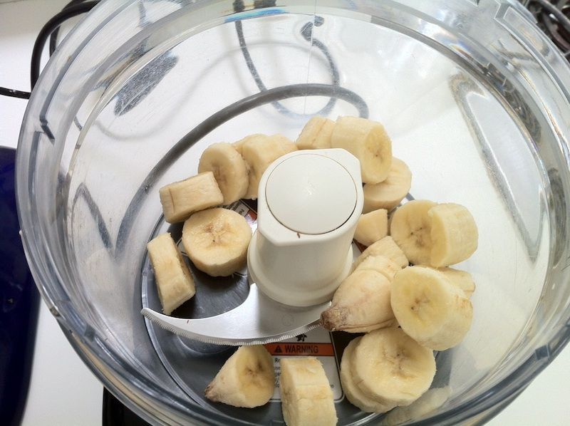 Εκτελεση Ξεφλουδίζουμε και κόβουμε τις μπανάνες σε ροδέλες και τις αφήνουμε στην κατάψυξη για 3,5 ώρες.Όταν έχουν παγώσει πολύ καλά και έχουν σκληρύνει (προσέξτε να μην είναι και κόκαλο) τις βγάζετε από την κατάψυξη και τις περνάτε από το μπλέντερ.