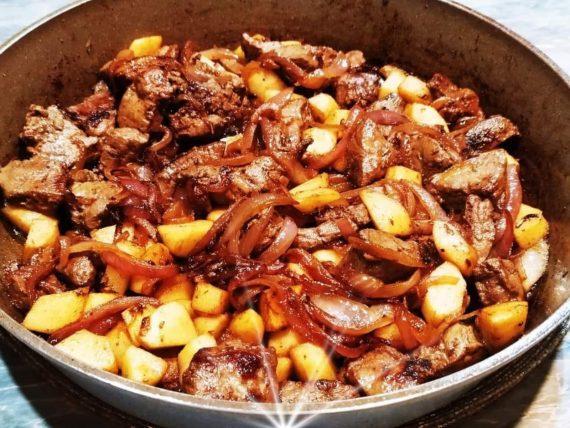 Σβήνουμε το φαγητό μας με το ξύδι και μόλις τσιγαριστεί και το συκώτι το σβήνουμε με το κρασί. Σε δύο λεπτά ρίχνουμε μέσα τα μήλα τα οποία τα έχουμε κόψει σε κύβους. Σκεπάζουμε το τηγάνι με το καπάκι και ψήνουμε το φαγητό μας για 10 λεπτά ακόμα. Σερβίρουμε με τηγανιτές πατάτες.
