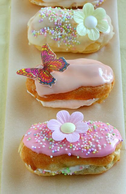 8. Τοποθετήστε κάθε ορθογώνιο του «μπισκότο» πάνω από κάθε εκλέρ, στη συνέχεια ψήνουμε για 10 λεπτά, στη συνέχεια αφήστε την πόρτα του φούρνου μισάνοιχτη περίπου 3 χιλιοστά (η λαβή μια ξύλινης κουτάλας είναι καλή για αυτό) και αφήστε το να ψηθεί για άλλα 20 λεπτά ή μέχρι να είναι ροδισμένα από πάνω και πλήρως φουσκωμένα. Αφήστε να κρυώσουν πριν τα γεμίσετε. ΠΩΣ ΝΑ ΚΑΝΕΤΕ ΤΗΝ ΚΡΕΜΑ ΖΑΧΑΡΟΠΛΑΣΤΙΚΗΣ: 1. Ανακατέψτε τους κρόκους των αυγών και τη ζάχαρη, στη συνέχεια, προσθέστε το κορν φλαουρ και ανακατεύουμε μέχρι το μίγμα γίνεται απαλό κίτρινο και συμπυκνωμένο. 2. Βάλτε και ξύστε τη βανίλια στο γάλα και αφήνουμε να σιγοβράσει. 3. ρίχνουμε σιγάσιγά το γάλα στο μείγμα κρόκου αυγού σιγάσιγά ενώ δεν σταματάμε να ανακατεύουμε συνεχώς.. 4. Βάλτε πάλι πίσω στην κατσαρόλα και αφήνουμε να πάρει βράση, ενώ συνεχίζουμε να ανακατεύουμε 5. Αφήστε το μείγμα να κρυώσει για περίπου 10 λεπτά, έτσι ώστε δεν είναι πλέον σε σημείο βρασμού, τότε ρίχνουμε ελαφρά το βούτυρο μέχρι το μίγμα να είναι λείο και γυαλιστερό. 6. Τοποθετείστε το μίγμα σε ένα άλλο μπολ και καλύψτε με πλαστική μεμβράνη μέχρι να έτοιμη προς χρήση. Μόλις είστε έτοιμοι να γεμίσετε τα εκλέρ, χτυπήστε την κρέμα γάλακτος και στη συνέχεια αναμείξτε προσεκτικά μαζί την κρέμα και την κρέμα ζαχαροπλαστικής με μια σπάτουλα. 7. Γεμίστε μια σακούλα ζαχαροπλαστικής με το μίγμα στη συνέχεια γεμίστε κάθε εκλέρ με την κρέμα ζαχαροπλαστικής σε τρία σημεία και ρίξτε ζάχαρη άχνη πριν το σερβίρετε! Τώρα μπορείτε πραγματικά να αποθηκεύσετε τα κενά εκλεράκια μέχρι και μια εβδομάδα σε ένα αεροστεγές δοχείο, και να γεμίσετε πριν να τα σερβίρετε. !