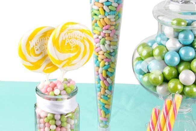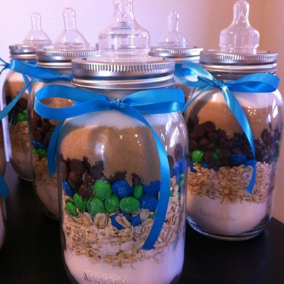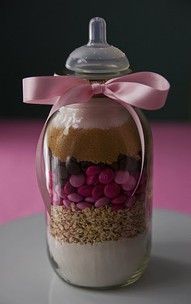 Γεμίστε γυάλινα βαζάκια με τριμμένο μπισκότο,καραμελάκια,σοκολατάκια ή ακόμα και γλυκό του κουταλιού.Κολλήστε στο καπάκι μια πιπίλα σιλικόνης και στολίστε το με μια κορδέλα.