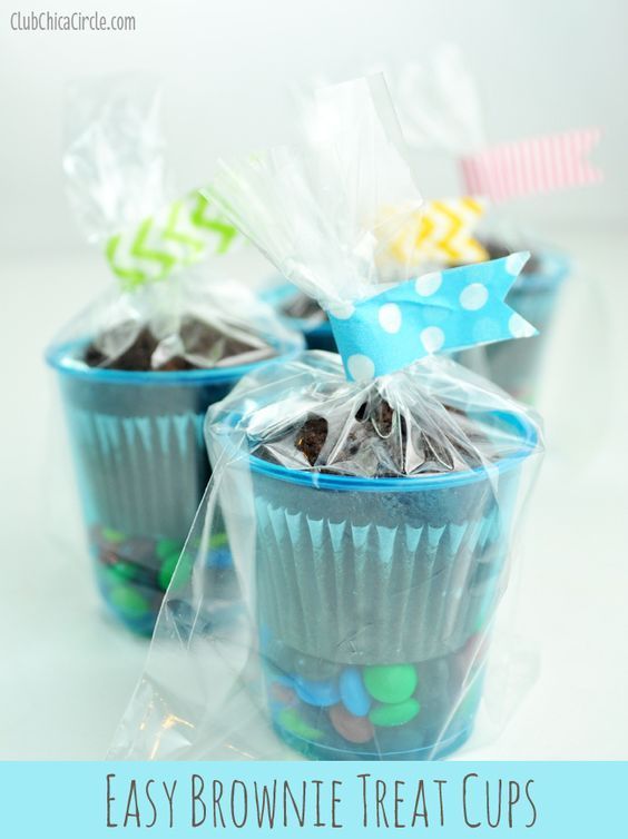 Βάλτε σε πλαστικά ποτηράκια πολύχρωμα καραμελάκια και brownies.Συνταγή για brownies θα βρείτε εδώ