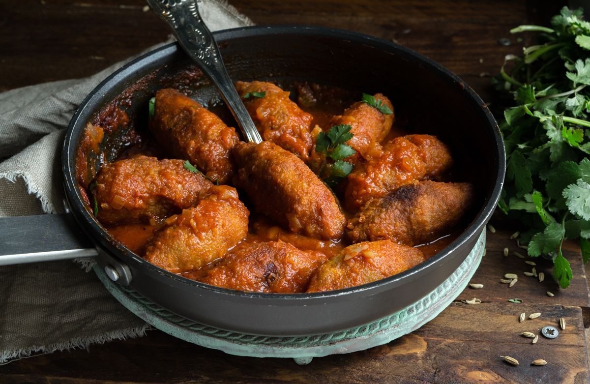 Για την σάλτσα 1 κρεμμύδι 2 σκελίδες σκόρδο 250 ml. χυμό ντομάτας 1 κουταλιά της σούπας τοματοπελτέ 1 κουταλιά της σούπας ζάχαρη 100 ml. κόκκινο κρασί 2-3 κόκκους μπαχάρι Ελάχιστο κύμινο Ελάχιστη κανέλα Πιπέρι Αλάτι 2 κουταλιές της σούπας Παρθένο Σησαμέλαιο