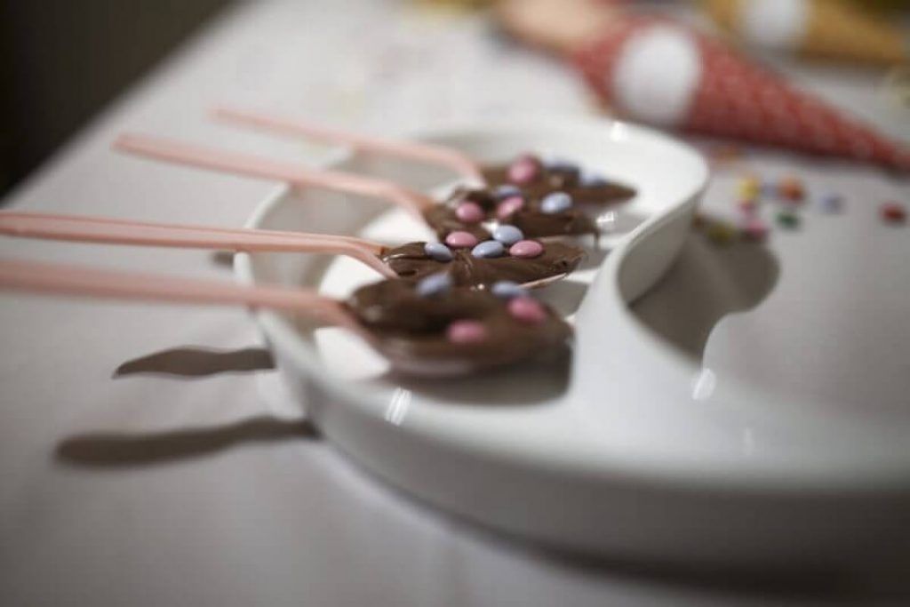 Σε γαλάζια ή ροζ κουταλάκια βάλτε μία κουταλιά μερέντα και στολίστε τα με smarties ή χρωματιστή τρούφα. Το βασικό είναι τριγύρω τους να στήσετε ένα ωραίο ντεκόρ. Η φωτογραφία μας μιλάει από μόνη της.