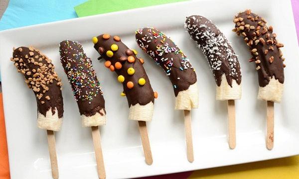 Περνάμε τις μπανάνες σε ένα ξυλάκι ή σε στικ και τις βουτάμε σε λιωμένη κουβερτούρα. Στολίζουμε με τρούφα ή τριμμένους ξηρούς καρπούς και τις βάζουμε για λίγη ώρα στο ψυγείο.