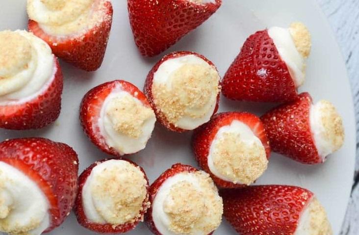 Καθαρίζετε τις φράουλες και με ένα μαχαιράκι αφαιρείτε προσεκτικά την ψίχα τους. Για τη γέμιση ανακατεύετε ένα κουτί τυρί κρέμα και ένα κουτί ζαχαρούχο γάλα. Στο τέλος πασπαλίζετε με τρίμματα μπισκότου.