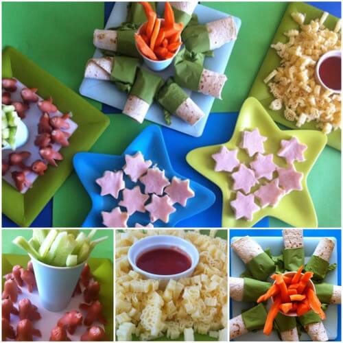 Λουκανικάκια χταποδάκια Ντοματίνια γεμισμένα με τυρί κρέμα Στικς καροτάκια-αγγουράκια Μακαρονάκια με σχέδιο (εγώ έφταξα δεινοσαυράκια) με κέτσαπ βιολογική Τοστάκια αστεράκια με γαλοπούλα και τυρί σε φέτες (αν δεν έχετε κουπάτ μπορείτε απλά με ένα ποτήρι να τα κόψετε στρογγυλά η ακόμα και τετραγωνάκια κομμένα με μαχαίρι) Τορτίγιας με κομματάκια ντομάτας και τυρί κρέμα.