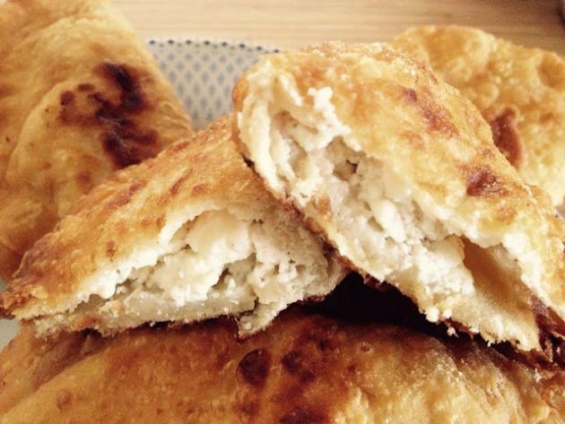 Εκτέλεση Ζυμωνουμε καλα ολα τα υλικα μεχρι να εχουμε μια ευπλαστη μαλακια ζυμη και την αφηνουμε για 20′ να ξεκουραστει. Ανοιγουμε με τον πλαστη σε αλευρωμενη επιφανεια ενα λεπτο φυλλο και κοβουμε κυκλους με ενα μεγαλο ποτηρι του νερου. Ανακατευουμε τα υλικα της γεμισης και βαζουμε σε καθε πιτακι απο μια κουταλια γεμιση και κλεινουμε μισοφεγγαρο βαζοντας λιγο νερακι στις ενωσεις για να κολλησουν. Τηγανιζουμε τις τυροπιτες σε αρκετο λαδι και απο τις δυο πλευρες μεχρι να ροδισουν. Εναλλακτικα τις ψηνουμε στο φουρνο σε αντικολλητικο χαρτι στους 180 βαθμους για περιπου 25′ αφου τις λαδωσουμε ελαφρως απο πανω.