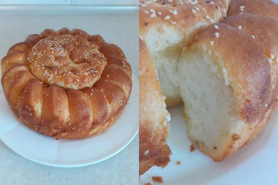 Τοποθετούμε το ένα πάνω στην άκρη του άλλου ψωμιού και αλείφουμε με βούτυρο το καθένα ξεχωριστά. Συνεχίζουμε αυτή την διαδικασία κυκλικά. Όταν τελειώσουμε, στο κέντρο του ψωμιού βάζουμε άλλη μία στρογγυλή μπαλίτσα από ζύμη. Αλείφουμε με επιπλέον βούτυρο. Το ψήνουμε για 30 λεπτά στον φούρνο.