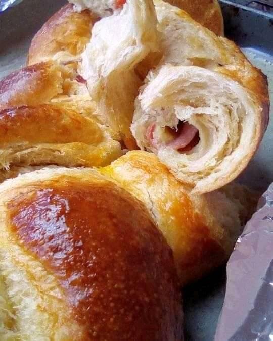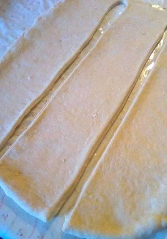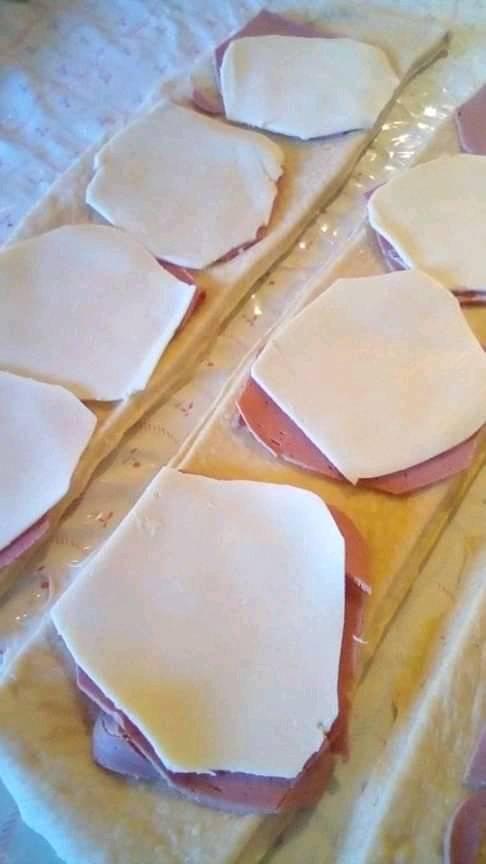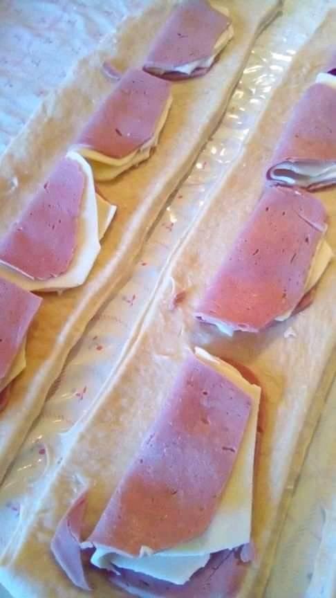 Αυτό το φύλλο το κόβουμε σε 3 λωρίδες!Τοποθετούμε πάνω στις λωρίδες φέτες ζαμπόν τυρί και τις κλείνουμε όπως δείχνουν οι φωτογραφίες.