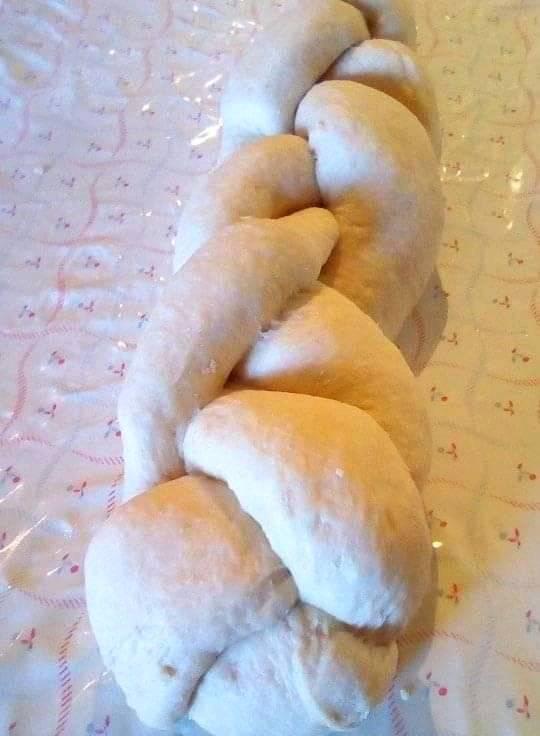 Στην συνεχεία τις πλέκουμε και τοποθετούμε το τσουρέκι στην λαδόκολλα. Το αφήνουμε 1 ώρα
