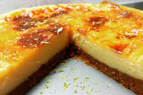 Χτυπάμε τα μπισκότα στο μπλέντερ μέχρι να γίνουν σκόνη και τα ανακατεύουμε καλά με το λιωμένο βούτυρο και την ζάχαρη. Βουτυρώνουμε μια ταρτιέρα 24 εκ. με αποστομένο πάτο. Στη συνέχεια, απλώνουμε το μείγμα του μπισκότου στη ταρτιέρα και το πιέζουμε με ένα κουτάλι.