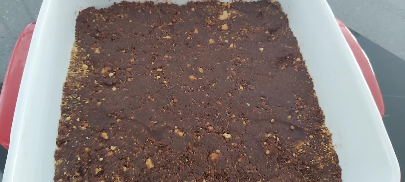 Στην αρχή αλέθουμε τα μπισκότα στο μούλτι. Στη συνέχεια τα βάζουμε μέσα σε ένα μικρό πυρίμαχο ταψί. Σε μια κατσαρόλα βάζουμε την κρέμα γάλακτος να ζεσταθεί και ρίχνουμε σε κομμάτια την σοκολάτα. Ανακατεύουμε μέχρι να λιώσει. Το μείγμα το ρίχνουμε πάνω από τα μπισκότα και τρίβουμε με τα χέρια μας.