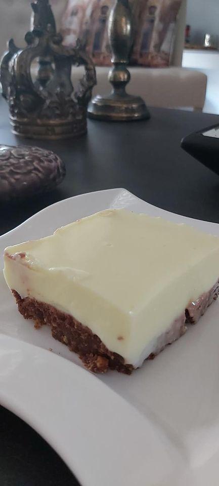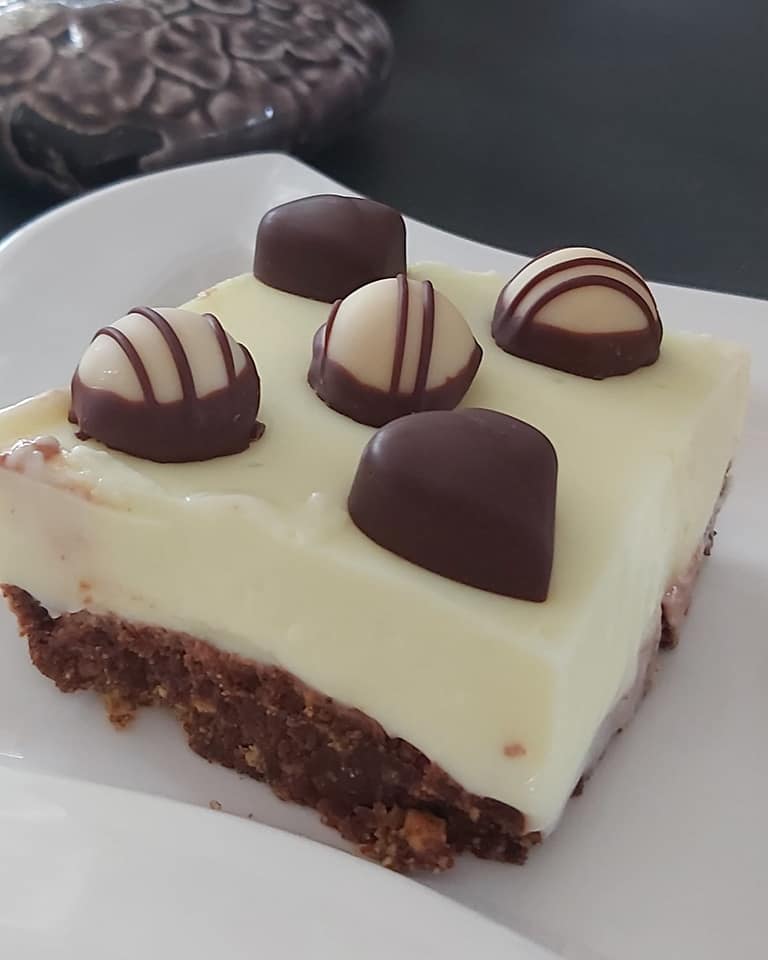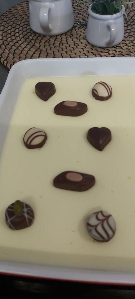 Τοποθετούμε το ταψί στο ψυγείο για δύο με τρεις ώρες μέχρι να παγώσει. Γαρνίρουμε με σοκολατάκια και απολαμβάνουμε!