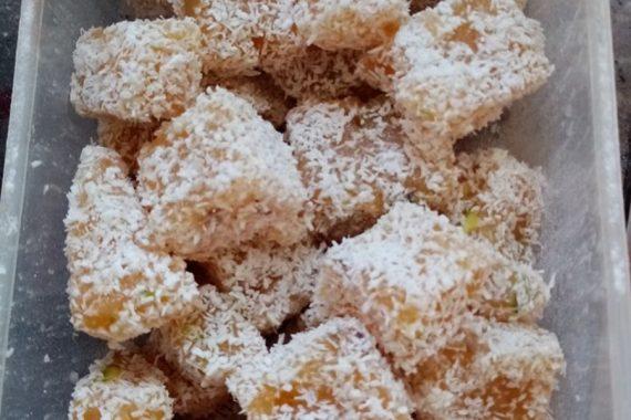 Αφού κρυώσουν τα αποθηκεύουμε σε ένα τάπερ και στη συνέχεια τα βάζουμε στο ψυγείο. Τα αφήνουμε για 2 με 3 ώρες και τα κόβουμε σε κομμάτια. Τέλος τα ρολάρουμε με ινδοκάρυδο.