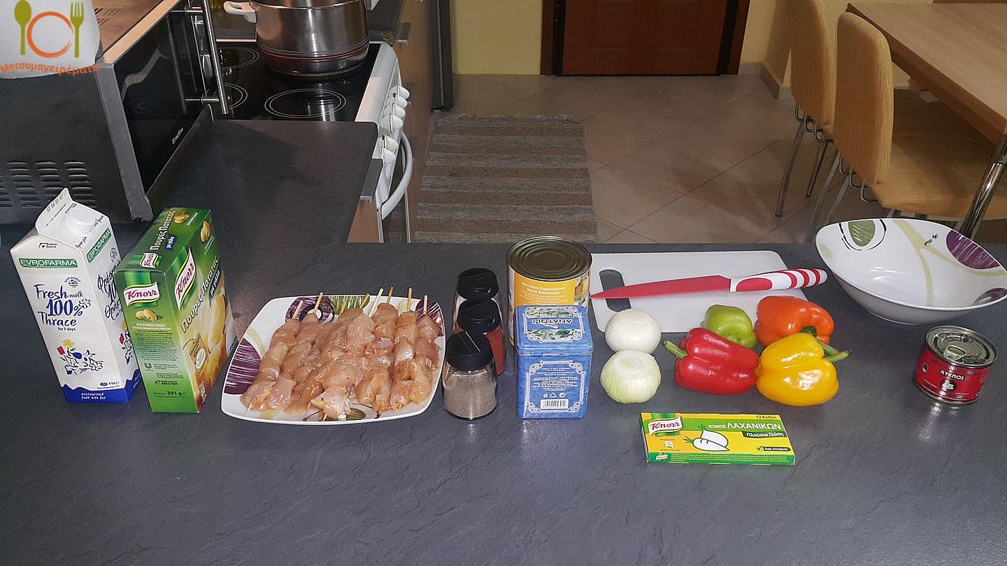 Υλικά Συνταγής 10 κοτοσουβλάκια στήθος για 4 άτομα. 4 πιπεριές χρωματιστές. 800 γρ. μανιτάρια. Σάλτσα πελτέ 200 γρ. 1 μεγάλο κρεμμύδι. 1 κύβο λαχανικών. Ελαιόλαδο. Αλάτι, κόκκινο πιπέρι γλυκό, ρίγανη, πιπέρι, δυόσμο. Πουρέ ή ρύζι.