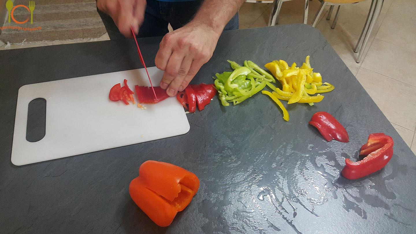 Πρώτα κόβουμε τις πιπεριές, το κρεμμύδι, τα μανιτάρια(αν δεν είναι κονσέρβα) και τις πιπεριές σε κομματάκια.
