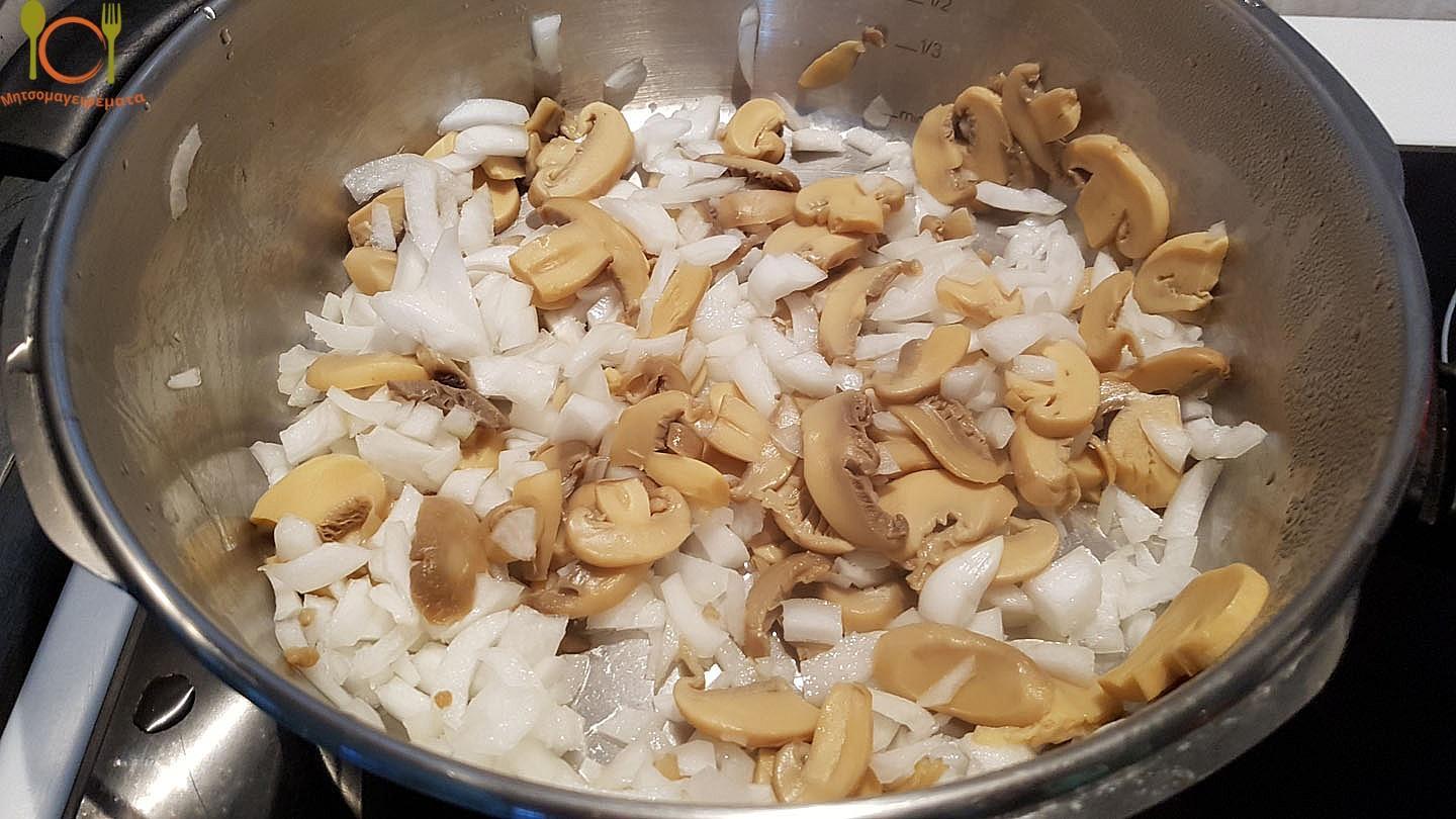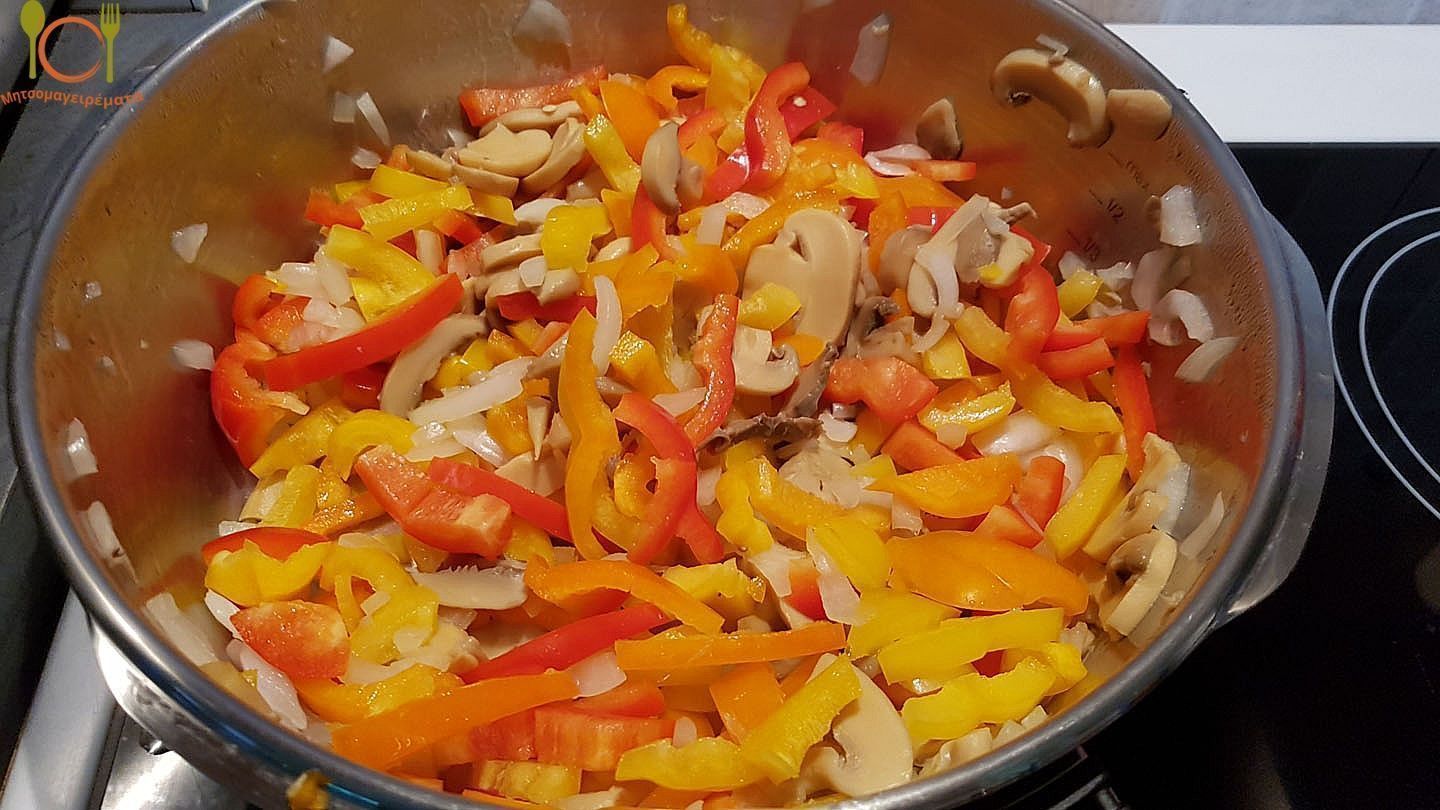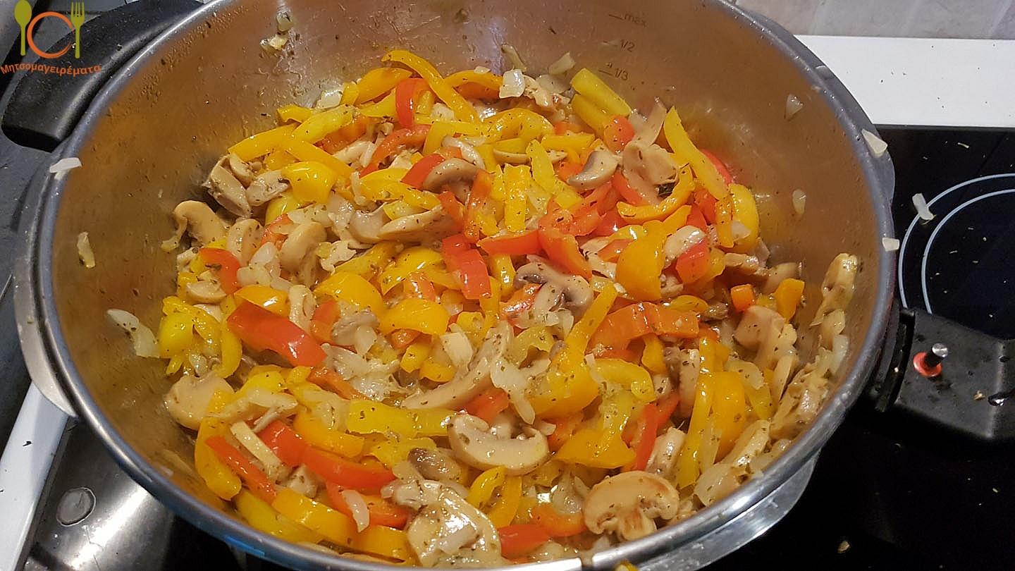 Καίμε τα μανιτάρια και τις πιπεριές, για να σωθούν τα υγρά τους και στην συνέχεια προσθέτουμε το ψιλοκομμένο κρεμμυδάκι.