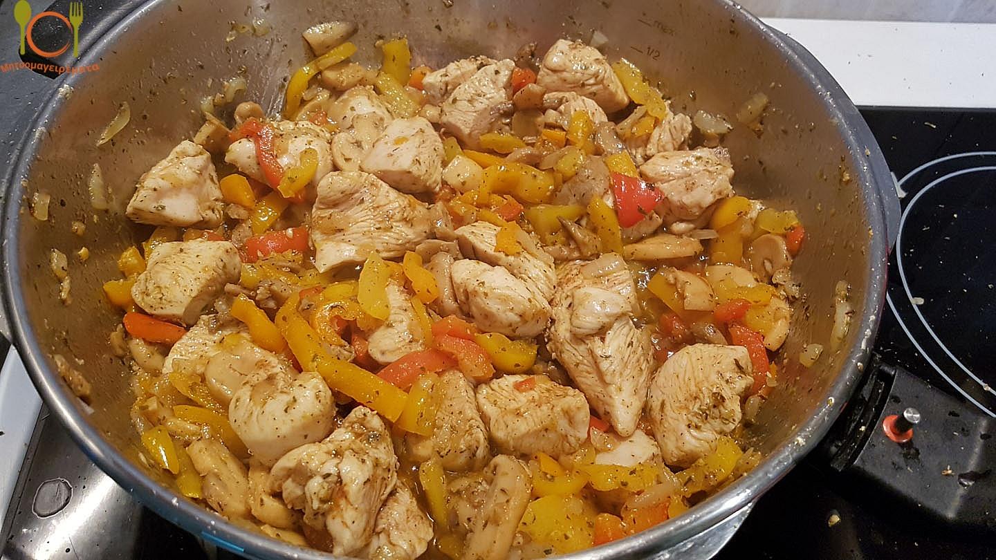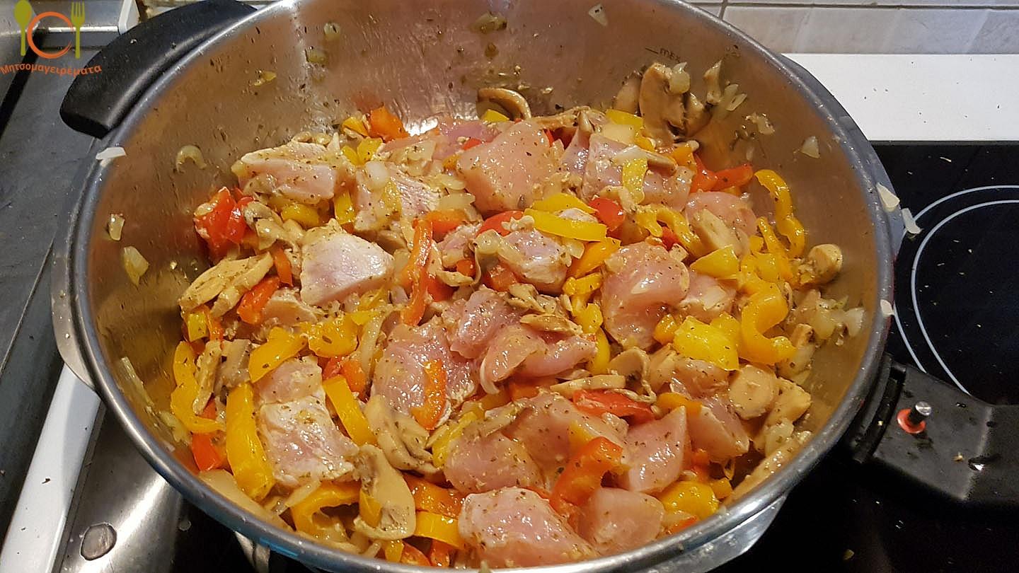 Ήρθε η ώρα να ρίξουμε τα κομματάκια κοτόπουλου! Τα βάζουμε και συνεχίζουμε το τσιγαρίσμα μέχρι να ασπρίσει το κοτόπουλο.