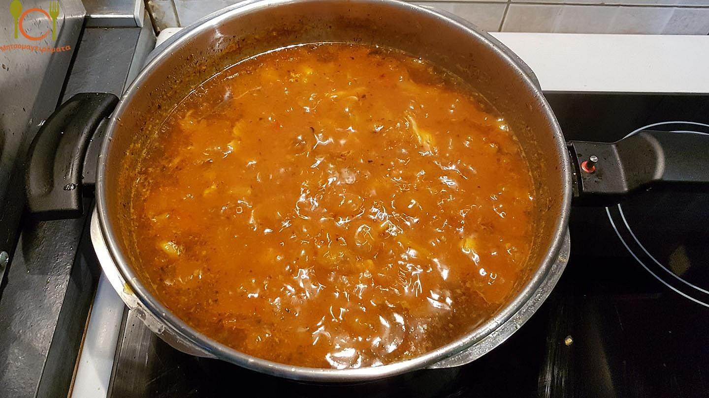 Όταν γίνει αυτό, τότε προσθέτουμε νερό, τον πελτέ ντομάτας(ή τριμμένη φρέσκια ντομάτα), τα μπαχαρικά, ένα κύβο λαχανικών και τα βράζουμε για περίπου 40 λεπτά.