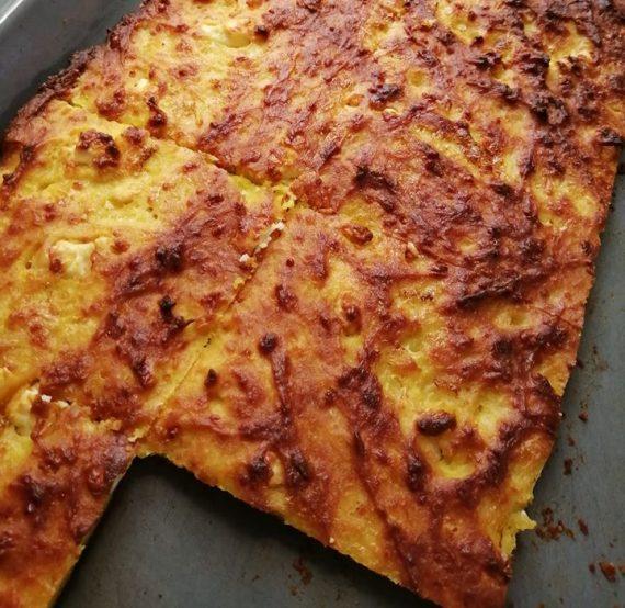Βουτυρώνουμε καλά ένα ταψί και ρίχνουμε μέσα το μείγμα μας. Πάνω από τον χυλό ρίχνουμε λίγο βούτυρο ή μαργαρίνη κομμένο σε κομματάκια. Αφήνουμε την πίτα μας στην άκρη να φουσκώσει περίπου για μία ώρα και μετά ψήνουμε στους 200 βαθμούς για 45 λεπτά με 1 ώρα ανάλογα τον φούρνο.