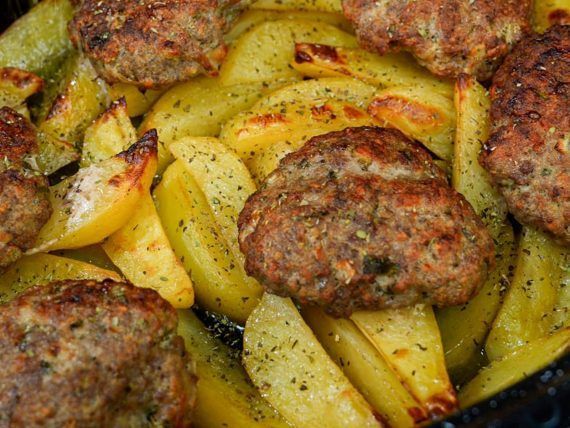 Put the potatoes in a casserole dish, sprinkle with a little olive oil, salt, pepper, mustard, lemon juice and mix. Put water, cover with a lid or aluminum foil and bake in a preheated oven in air at 180 for 40′-45′. In a large bowl, add all the ingredients for the burgers and knead well. Form 8 burgers, place them on top of the potatoes and bake without a lid in a preheated oven in air at 190 for about 45′. Sprinkle with a little oregano and enjoy.