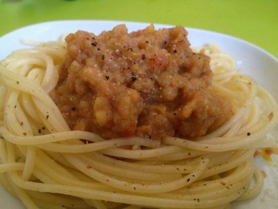 Preparation Finely chop the onion and garlic (or garlic pass from the press) and sauté in water at moderate intensity (eg 5/9) until the onion softens. Pour the tomato paste, and add the cooking water, lentils and spices (if intended for babies, then put spices in a little tea mesh to remove spices effortlessly, after cooking). Cook over low heat until lentils are tender (approx. 20 minutes). Turn the heat off and leave the pot uncovered. Add a little hot water from the pasta, if we feel that the sauce is thick. If using a pressure cooker, cook for 8 minutes, and leave the pot to cool on the hob. Meanwhile, put (at least) five liters of water to boil in large pot (with the lid on). When the water starts boiling, pour the pasta in, remove the lid, and cook al dente. Strain keeping some water in the pot to prevent the pasta from sticking together. Serve with freshly ground pepper and (optional) nutritional yeast.