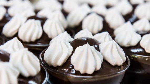 1 λίτρο γάλα σόγιας με γεύση σοκολάτα 1/2 πακέτο χοντροκομμένα μπισκότα μιράντα 70 γραμμ. κάστερ πάουντερ 1 φλυτζανάκι κρύο νερό 1 φλυτζανάκι ζάχαρη 60 γραμμ. κουβερτούρα λιωμένη 2 βανίλιες 1 μικρή συσκευασία φυτική σαντιγί τρούφα για το γαρνίρισμα