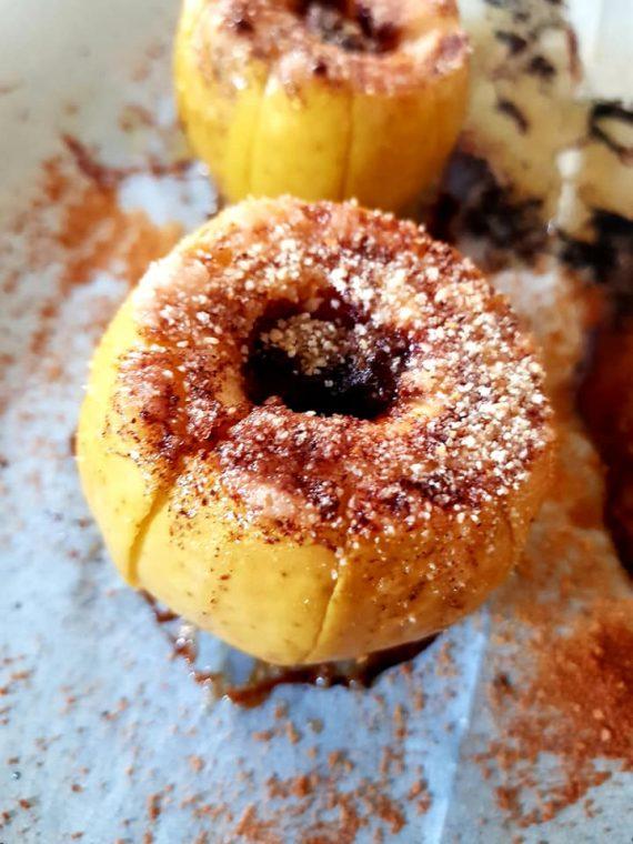 Στην αρχή κόβουμε τα καπάκια από τα μήλα. Τα τρυπάμε στην μέση και τα καθαρίζουμε από τα σπόρια. Τα βάζουμε σε ένα ταψί με λαδόκολλα. Σε ένα ποτήρι του νερού αναμειγνύουμε την κανέλα, την ζάχαρη και το λιωμένο βούτυρο. Στη μέση βάζουμε από ένα κομματάκι σοκολάτα και ψήνουμε τα μήλα μας στους 180 βαθμούς Κελσίου για 30-40 λεπτά.