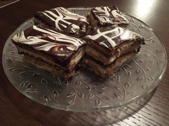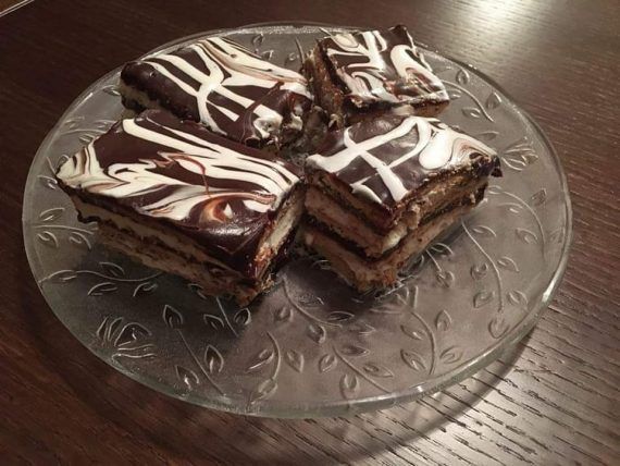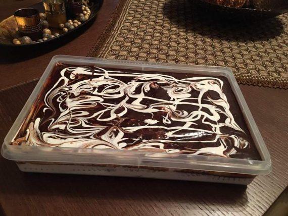 Εκτέλεση Χτυπάμε το Ζαχαρούχο με το μορφατ για να κάνουμε την άσπρη κρέμα. Σε ένα άλλο μπολ βάζουμε το βιταμ και το λιώνουμε στο φούρνο μικροκυμάτων Ρίχνουμε τις κουβερτούρες να λιώσουν, προσθέτουμε μισό ποτήρι άχνη. Χτυπάμε τα αβγά και τα ρίχνουμε στις κουβερτούρες να ενσωματωθούν όλα. Ρίχνοντάς τα στην ζέστη λιωμένη κουβερτούρα παστεριωνονται για να γίνει η σοκολατένια κρέμα. Σε ένα μπολάκι βάζουμε γάλα, βρέχουμε τα μπισκότα με το γάλα και τα στρώνουμε σε ένα τάπερ βάζοντας στρώσεις με κρέμα εναλλάξ άσπρη και καφέ. Σε σύνολο βγαίνουν δύο στρώσεις με άσπρη και δύο με καφέ κρέμα.