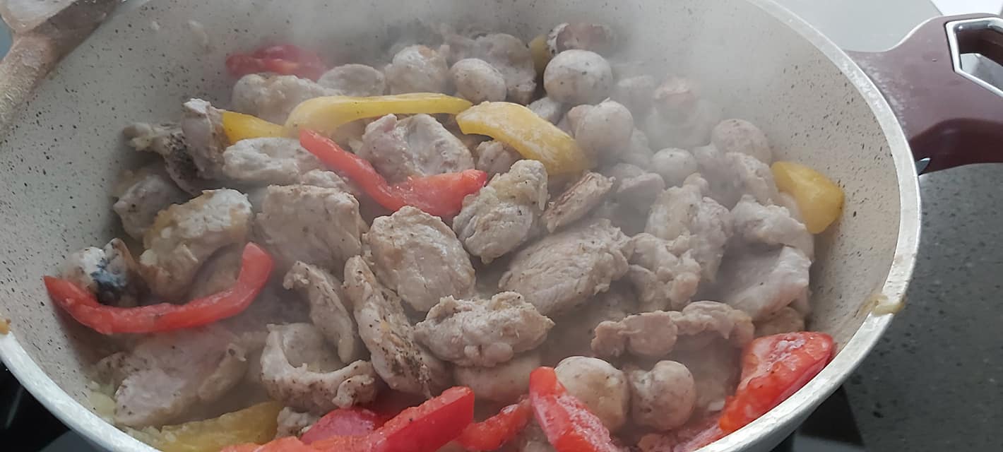 - πιπεριά 1/2 κόκκινη και 1/2 κίτρινη σε μακρόστενα κομμάτια