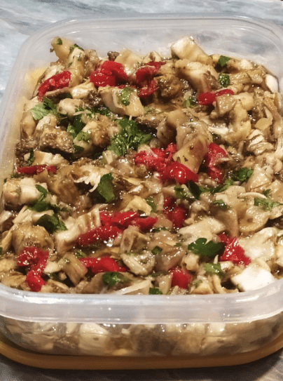 Ανακατεύουμε καλά και βάζουμε τα υλικά μας στο ψυγείο για μια ημέρα. Μπορούμε αν θέλουμε να προσθέσουμε και λίγες λιαστές ντομάτες. Θα πρέπει να δώσουμε ιδιαίτερη προσοχή στο ξίδι και στο αλάτι. Μπορεί πριν μπει στο ψυγείο να έχουμε την εντύπωση ότι χρειάζεται κι άλλο.