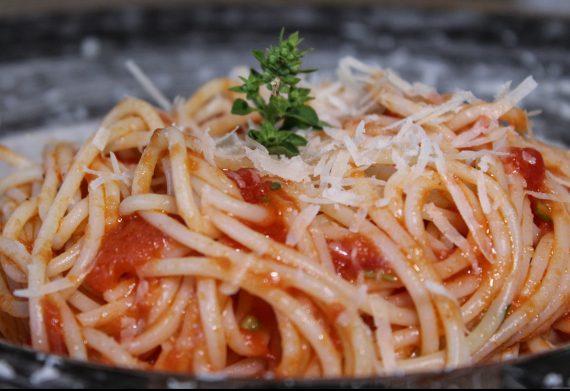 – (1 chilli pepper) – (2 cloves garlic) -(some basil) -(3 – 4 tbsp. olive oil) – (400 g chopped tomatoes, in can) -(some water) -(salt) -(pepper) -(parmesan, optionally)