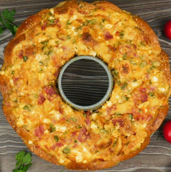 Συνταγή για σουφλέ με ψωμί στη φόρμα του κέικ. Αυτό το σουφλέ είναι πεντανόστιμο. Με κίτρινά τυριά και μπέικον. Σκίζει από εμφάνιση και γεύση
