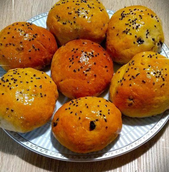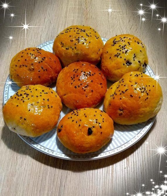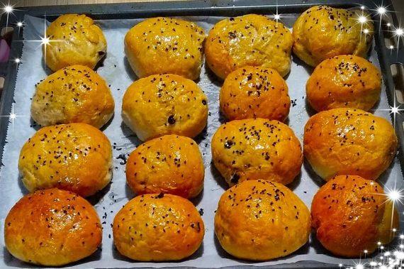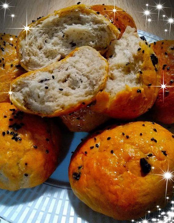 Προσθέτουμε τις σταφίδες, ζυμώνουμε και κόβουμε σε μικρά 16 στρογγυλά κομμάτια. Τα τοποθετούμε σε 2 ταψιά με λαδόκολλα και περιμένουμε πάλι περίπου μισή ώρα για να φουσκώσουν..Τα αλείφουμε με νερό και μαύρο σουσάμι και ψήνουμε σε προθερμασμενο φούρνο στους 170 βαθμούς στον αέρα 25 λεπτά περίπου.