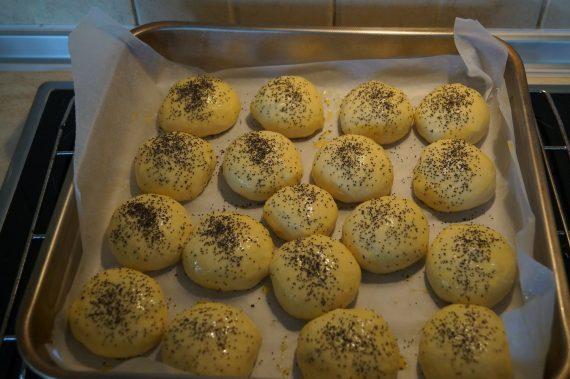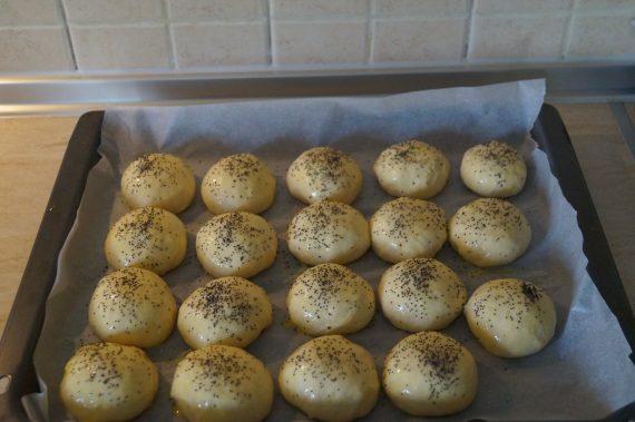 Κόβουμε περίπου 14 κομμάτια και τα πλάθουμε σε μικρά οβάλ ψωμάκια. Βάζουμε λαδόκολλα σε ένα ταψί. Ετοιμάζουμε ένα καρβελάκι βάζοντας 6 ψωμάκια το ένα δίπλα στο άλλο. Βγαίνουν περίπου 12 ψωμάκια. Αφήνουμε ένα δάχτυλο κενό μεταξύ τους και τα αφήνουμε να φουσκώσουν για μια ώρα, σκεπάζοντας τα με μια πετσέτα.