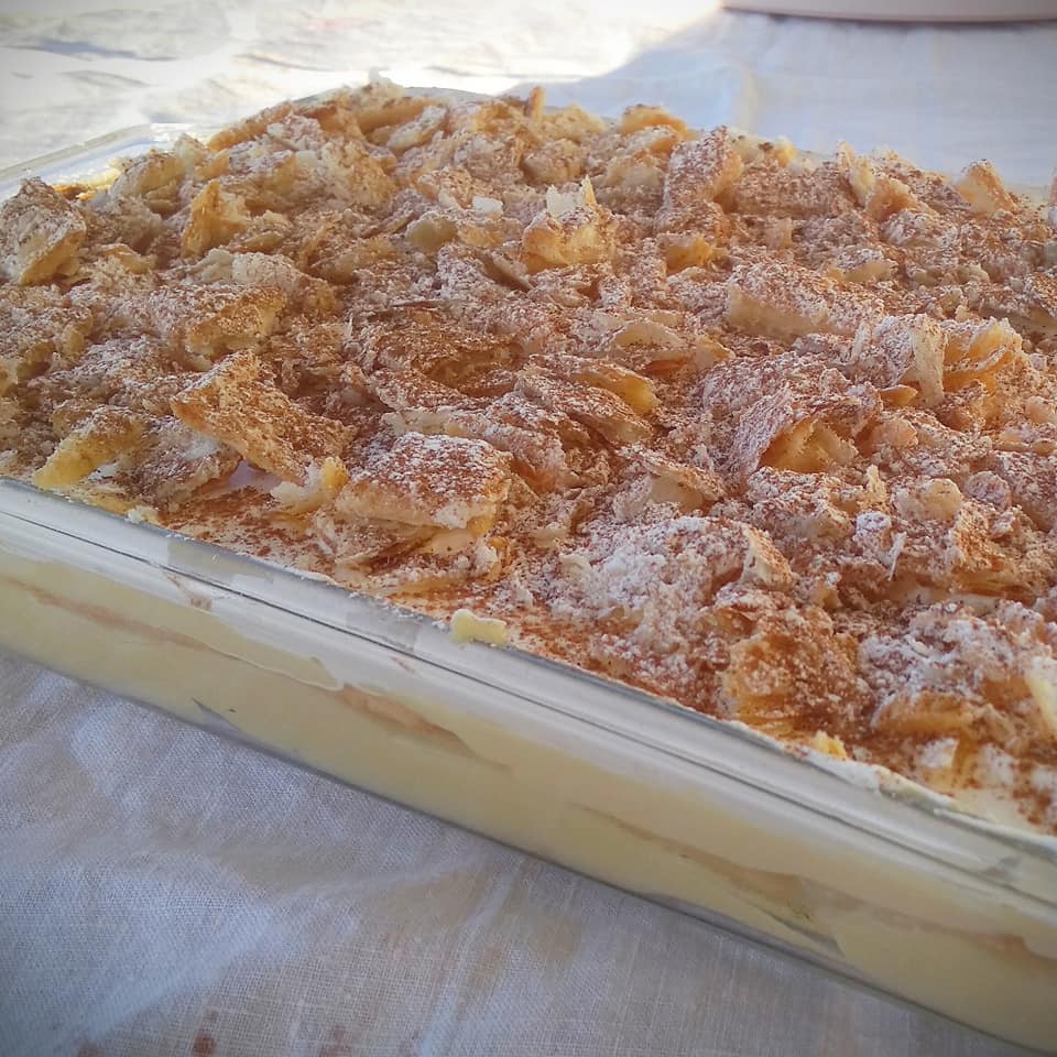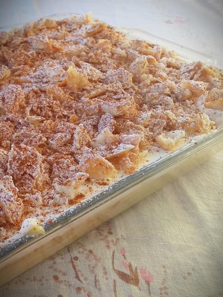 Τέλος πασπαλιστά προσθέτω το μπέικιν παουντερ και ανακατεύω αρχικά στην επιφάνεια της κρέμας να αφρίσει και να διαλυθεί. Ενσωματώνω μέσα στην κρέμα. Αδειάζω τη μισή κρέμα πάνω στα σφολιατίνια, κάνω μια στρώση ακόμα με σφολιατίνια και απλώνω την υπόλοιπη κρέμα. Όταν κρυώσει, χτυπάω την κρύα κρέμα γάλακτος σε σαντιγί και γαρνίρω το γλυκό.