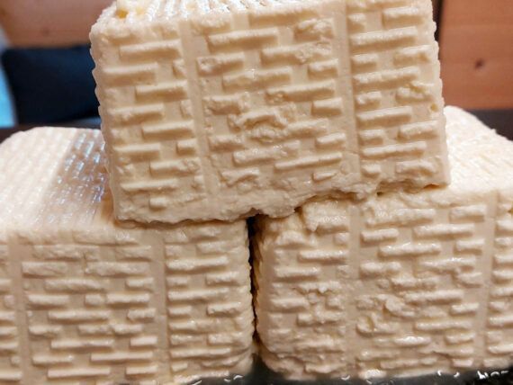 Αφήνουμε στην άκρη το γάλα για 50-60 λεπτά έτσι ώστε να λειτουργήσει η πυτιά. Αφού περάσει ο χρόνος, το γάλα θα έχει γίνει σαν ζελέ, οπότε το κόβουμε για να ανέβει το τυρόπηγμα πάνω και να καθίσει το τυρί. Το αφήνουμε και πάλι σε θερμοκρασία δωματίου για τουλάχιστον άλλη μισή ώρα, μπορεί και παραπάνω.
