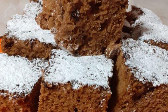 Βάζουμε το μείγμα μας σε ένα λαδωμένο ταψί ή σε μία φόρμα για κέικ και το ψήνουμε στους 170 βαθμούς Κελσίου για 50-60 λεπτά. Ο χρόνος ψησίματος διαφέρει ανάλογα τον φούρνο που έχει ο καθένας. Όταν κρυώσει καλά πασπαλίζουμε με λίγη ζάχαρη άχνη.