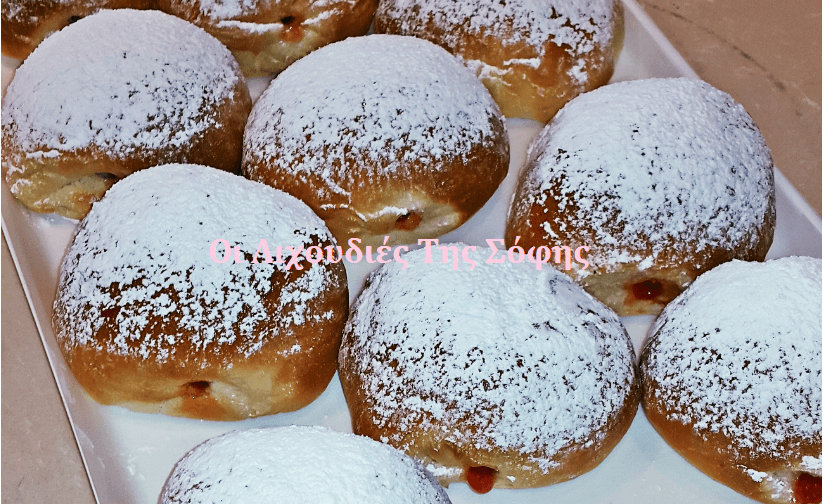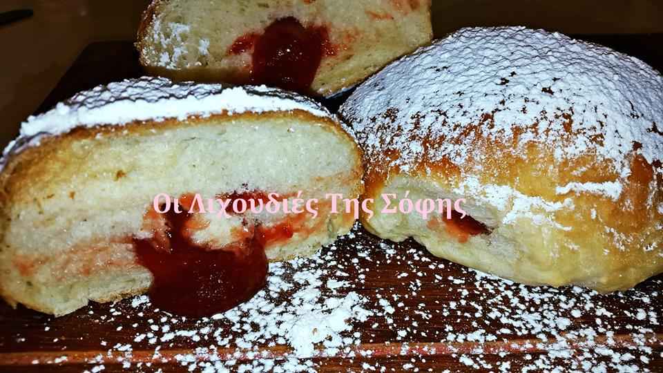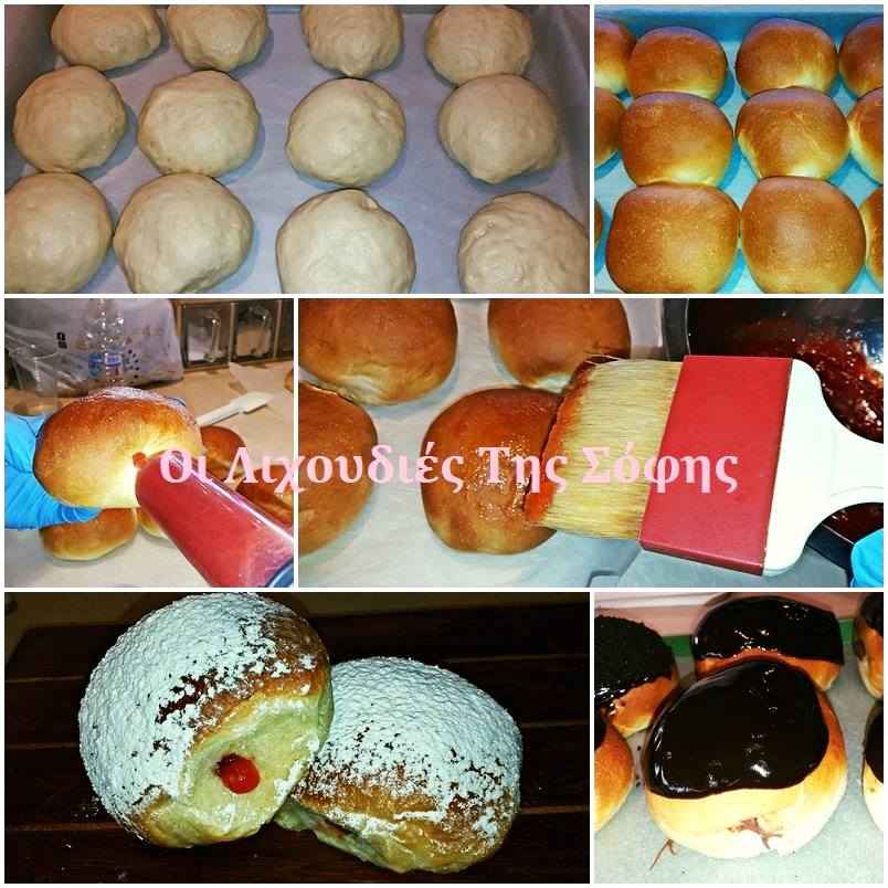 ΕΚΤΕΛΕΣΗ -Στον κάδο του μίξερ ρίχνω το γάλα,τα αυγά.την μαγιά και την ζάχαρη και χτυπάω για 3 λεπτάκια. -Προσθέτω όλο το αλεύρι και ζυμώνω μέχρι να ξεκολλήσει η ζύμη από τα τοιχώματα του κάδου και να μαζευτεί σε μπάλα.(Δεν προσθέτω αλεύρι!) Ρίχνω και το βούτυρο και ξαναζυμώνω μέχρι να το απορροφήσει όλο και να ξαναμαζευτεί σε μπάλα το ζυμάρι μου. -Βάζω τη ζύμη σε ένα μεγάλο λαδωμένο μπολ (σπορέλαιο) την σκεπάζω με μεμβράνη και την αφήνω να φουσκώσει σε ζεστό μέρος μέχρι να διπλασιαστεί σε όγκο (1 ώρα περίπου). Κοβω κομματια τα ζυγιζω να ειναι 80 γρ.το καθένα,τα πλαθω μπαλακια και τα βαζω σε ταψι με λαδοκολα σε αποσταση4-5 εκ.μεταξυ τους. Τα αφηνω να ξαναφουσκωσουν 30 λεπτα και τα ψηνω στους 180 15-17 λεπτα Αφου κρυωσουν καλα,με μια συριγγα η με κορνε με μυτη τα γεμιζω με μαρμελαδα η πραλινα σοκολατας,κανοντας 2-3 τρυπιτσες γυρω γυρω προσεχοντας μην τα παραγεμισω και ξεχυλισει η γεμιση. Αυτα που θα γεμισω με μαρμελαδα αλειφω μ ενα πινελο την επιφανεια με ελαχιστη μαρμελαδα και πασπαλιζω με αχνη ζαχαρη.