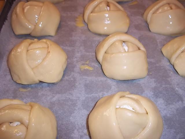 Τοποθετώ στις λαμαρίνες, αλείφω με το αυγό λίγο χτυπημένο και αφήνω για 20min, να φουσκώσουν λίγο. Ψήνω σε 180oC (και όχι 200oC όπως λέει η αρχική συνταγή), περίπου για 20min.