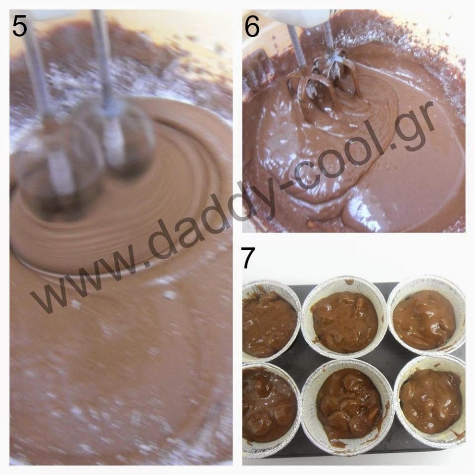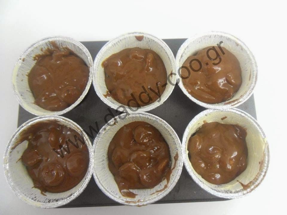 Γεμίζουμε τις θήκες με το μείγμα (λιγότερο από το μισό γιατί φουσκώνουν!)