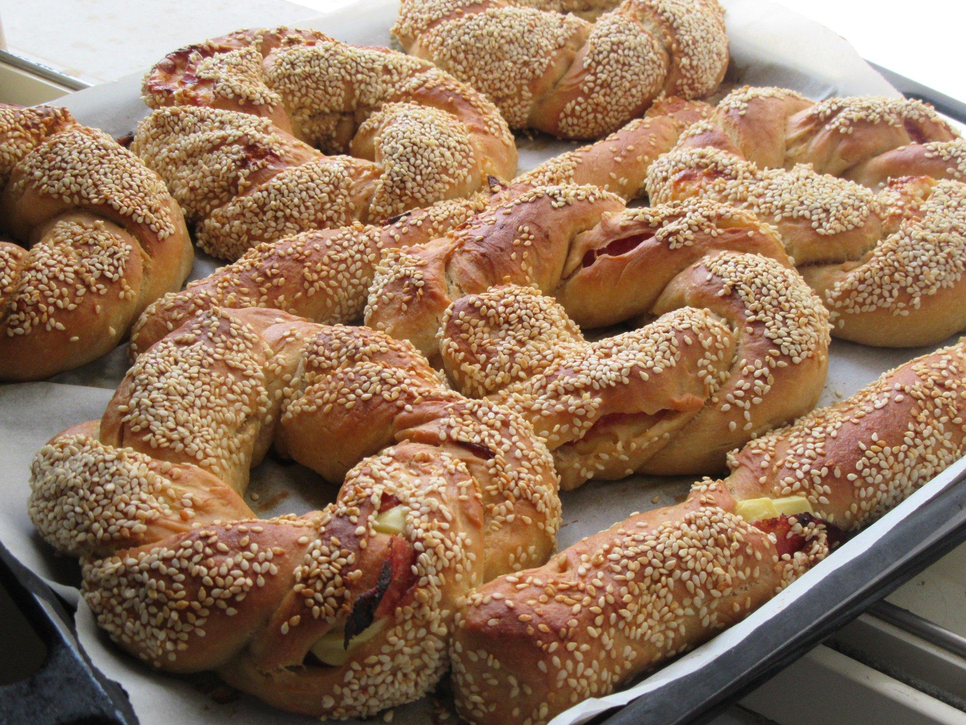 Αναμιγνύουμε όλα τα υλικά μαζί ξεκινώντας από το χτύπημα του αυγού αφήνουμε σκεπασμένο 30 με 40 λεπτά το ζυμαράκι να ξεκουραστεί Πλάθουμε ανοίγουμε με το χέρι μας βάζουμε στις κοτσίδες τυρί σαλάμι αέρος γαλοπούλα καπνιστή κλείνουμε φτιάχνουμε 2 κοτσίδες τις ενώνουμε και το βουτάμε στο νερομελο πρώτα και μετά στο σουσάμι τα βάζουμε πάνω σε λαδόκολλα και ψήνουμε στους 180 βαθμούς για 25 λεπτά.